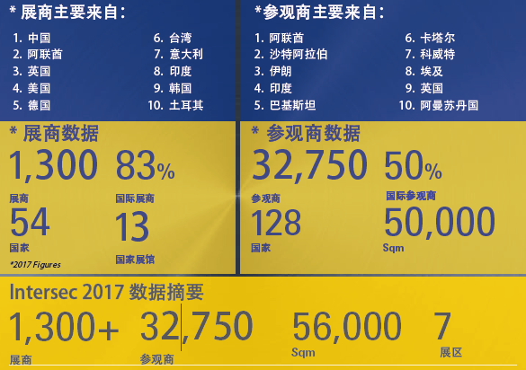 2019年的Intersec有來(lái)自60多個(gè)國(guó)家的1354家參展商參展,85%為國(guó)際展商,其中中國(guó)參展商有243家,中國(guó)勞保展商約50家。吸引了來(lái)自129個(gè)國(guó)家的32750名觀眾。