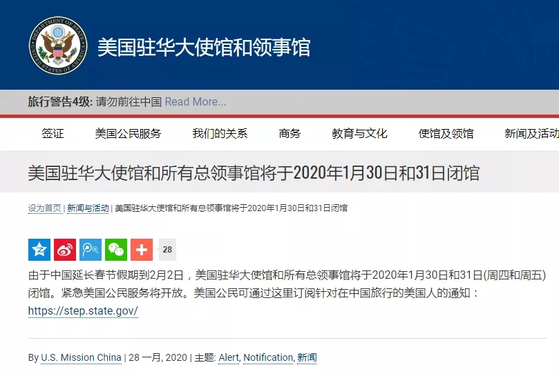 此前大使館發(fā)布消息,稱由于中國延長春節(jié)假期到2月2日,美國駐華大使館和所有總領(lǐng)事館將于2020年1月30日和31日(周四和周五)閉館,緊急美國公民服務(wù)將開放。