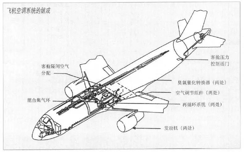 現(xiàn)代飛機的客艙空氣調(diào)節(jié)系統(tǒng)包括引氣系統(tǒng)、臭氧轉(zhuǎn)換器、空氣調(diào)節(jié)組件、混合集氣環(huán)、再循環(huán)系統(tǒng)、客艙通風系統(tǒng)以及客艙壓力控制系統(tǒng)。