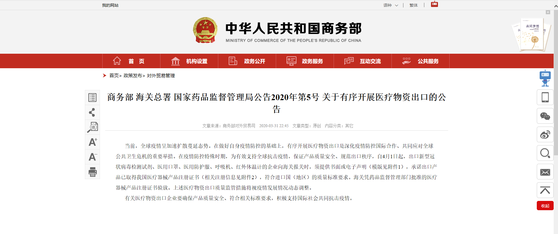 3月31日晚,商務(wù)部、海關(guān)總署、國(guó)家藥品監(jiān)督管理局緊急發(fā)布了一則通知——《關(guān)于有序開展醫(yī)療物資出口的公告》(2020年第5號(hào))。