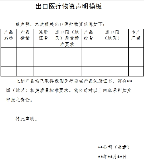 (出口醫(yī)療物資聲明:表格不能留空,表頭不要有模板兩個(gè)字,蓋生產(chǎn)銷(xiāo)售單位公章,每項(xiàng)必須填滿(mǎn))