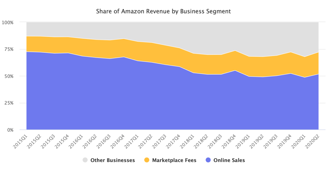 第三季度第三方賣方服務(wù)收入為181億美元,占總收入的20.4%。2016年,來自市場的收入僅占總數(shù)的14.4%。后期亞馬遜平臺建立了AWS和廣告等新業(yè)務(wù),將自營銷售在總收入中的份額降低到50%,但市場收入份額依然在持續(xù)增長。