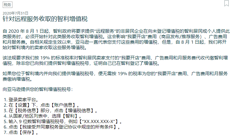 近日,有不少賣家收到了亞馬遜平臺的通知:自2020年8月1日起,智利政府將要求“遠程服務(wù)”的非居民企業(yè)在向未登記增值稅的智利居民或個人提供此類服務(wù)時,必須開始針對此類服務(wù)收取智利增值稅。