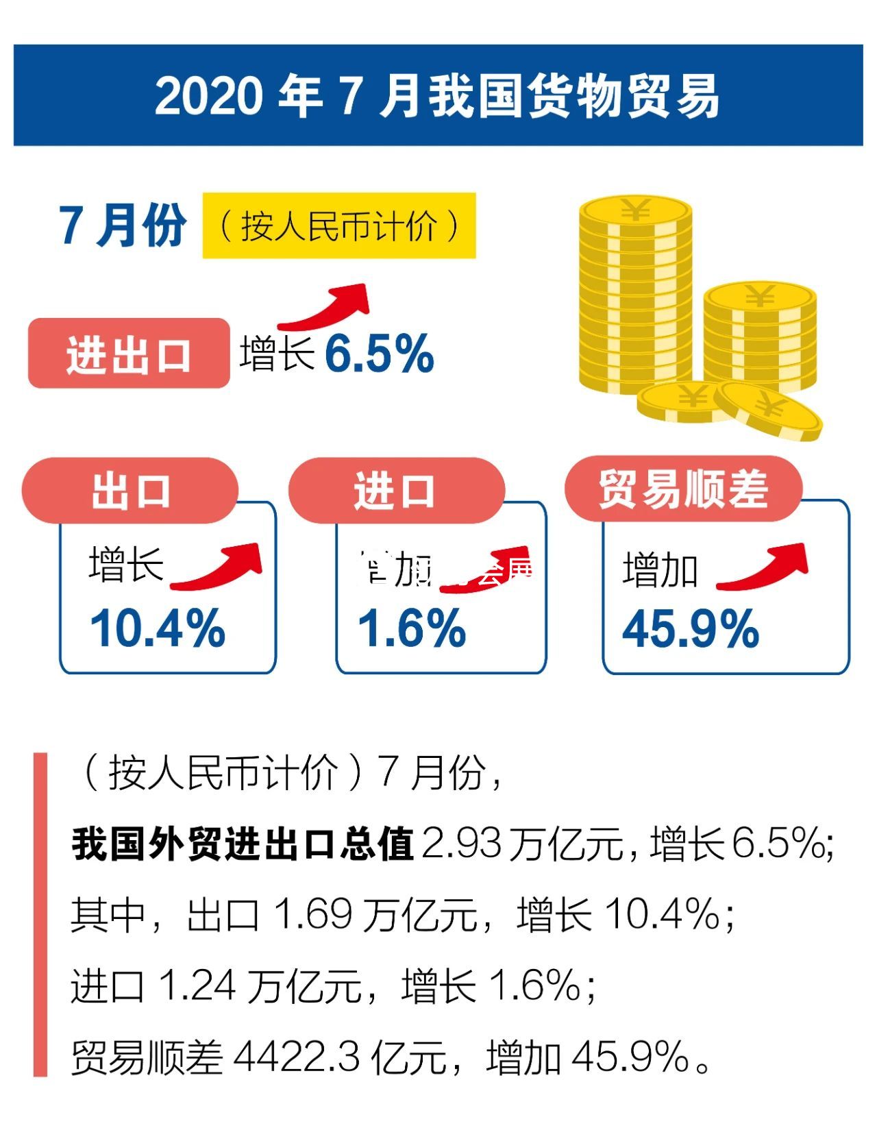 繼6月進(jìn)出口增速雙雙回正后,7月我國(guó)外貿(mào)進(jìn)出口2.93萬(wàn)億元,增長(zhǎng)6.5%。其中,外貿(mào)出口強(qiáng)勢(shì)實(shí)現(xiàn)兩位數(shù)增長(zhǎng),達(dá)到1.69萬(wàn)億元,增長(zhǎng)10.4%;進(jìn)口1.24萬(wàn)億元,增長(zhǎng)1.6%。