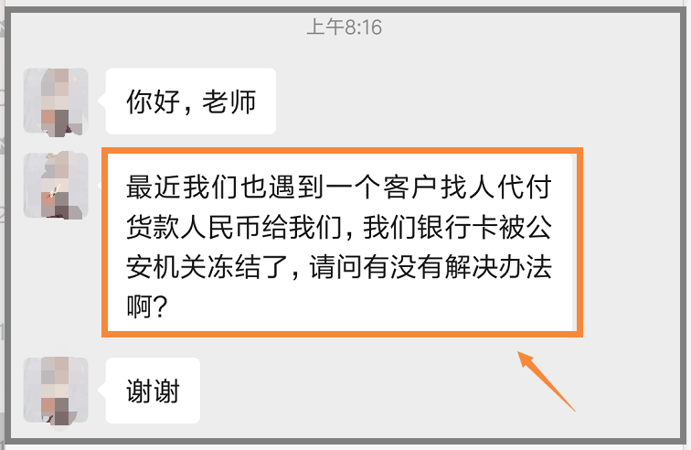 一種情況是,客戶找人代付人民幣貨款,我們收款。收款后發(fā)現(xiàn)賬戶或銀行卡被公安機關凍結了。