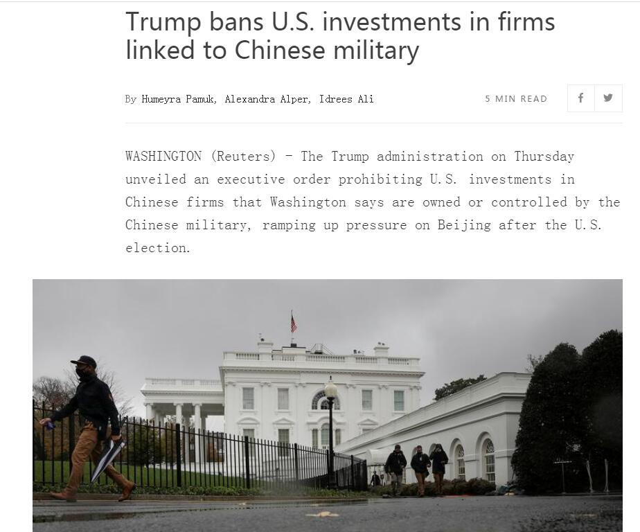 路透社消息,11月12日,特朗普政府公布了一項(xiàng)行政命令,禁止美國企業(yè)對(duì)部分中國公司的投資,限制對(duì)象「由中國軍方擁有或控制」的企業(yè)。