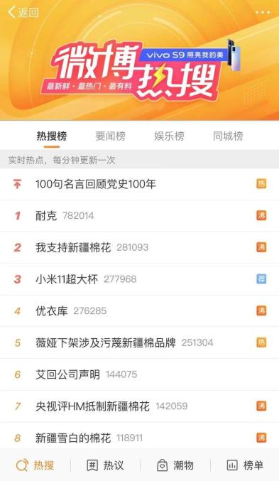 目前,H&M事件在網(wǎng)上仍在發(fā)酵,自事情發(fā)生以來,H&M相關(guān)話題持續(xù)占據(jù)微博等社交平臺(tái)熱搜榜單,耐克、優(yōu)衣庫(kù)等品牌也因網(wǎng)友指出抵制新疆棉花被沖上微博熱搜。