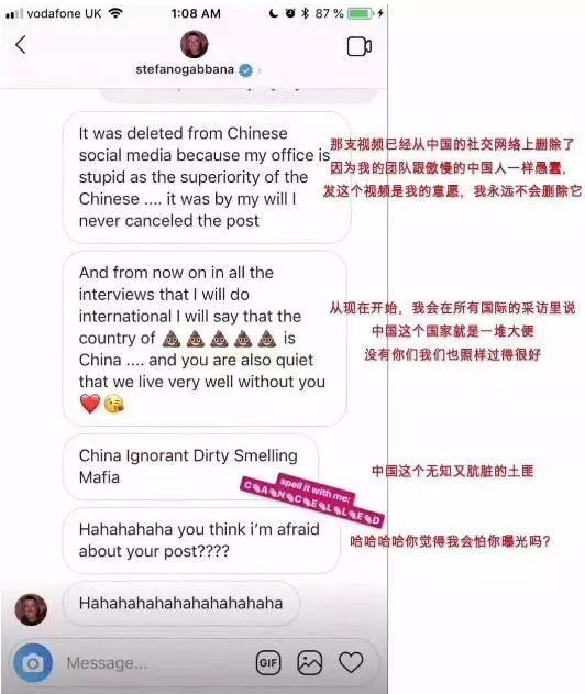 遭受輿論壓力的D&G并沒有對(duì)此迅速作出澄清或回應(yīng),反而品牌創(chuàng)始人Stefano Gabbnna還在其個(gè)人社交平臺(tái)INS上與網(wǎng)友對(duì)罵并發(fā)表辱華言論,其操作堪稱迷惑。最后事件以D&G遭全網(wǎng)封殺及兩名創(chuàng)始人公開道歉收尾。來源 / 網(wǎng)絡(luò)