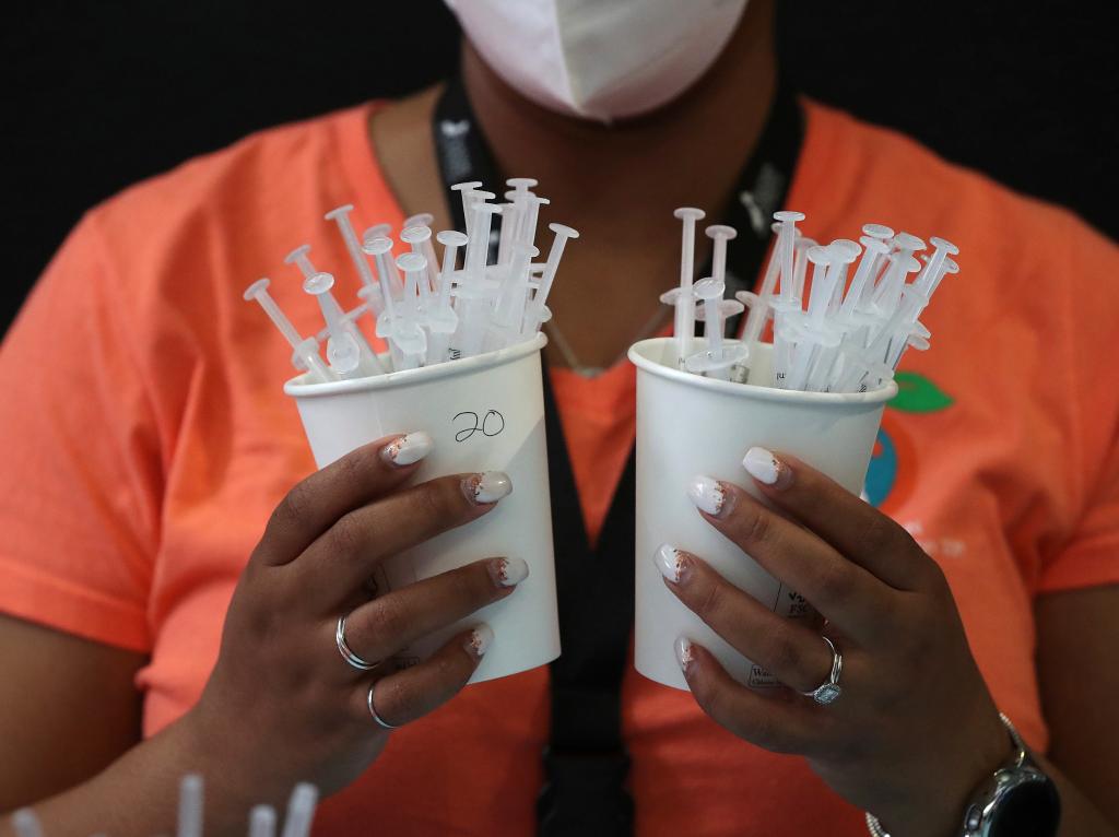 3月24日,一名醫(yī)務(wù)人員在美國亞特蘭大一處疫苗接種中心準(zhǔn)備新冠疫苗。新華社/美聯(lián)