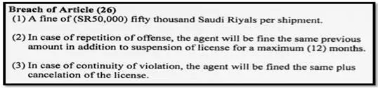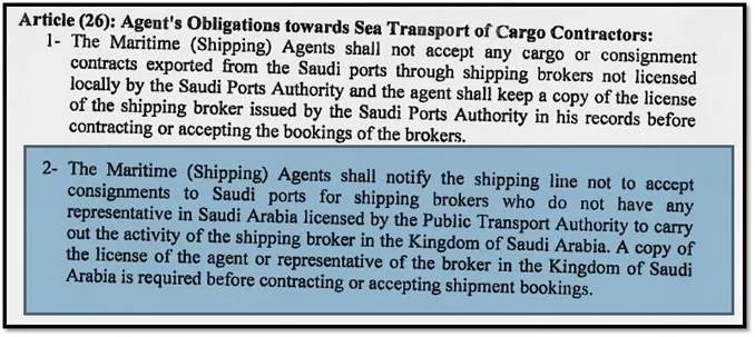 根據(jù)沙特港務(wù)局(Saudi Port Authority)在第 26 條中的規(guī)定,所有沙特收貨人或通知人,如果為當(dāng)?shù)刎涍\(yùn)代理,則必須獲得由公共運(yùn)輸局(Public Transport Authority (PTA))簽發(fā)的貨運(yùn)代理許可證,否則由此引起的罰金或不能清關(guān)的風(fēng)險(xiǎn)由客戶自行承擔(dān)。