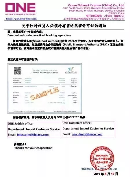 為確保新規(guī)定能順利實(shí)施,請盡力協(xié)調(diào)確保在貨物到達(dá)之前,必須將公共運(yùn)輸局 (PTA) 簽發(fā)的貨運(yùn)代理許可證副本遞交給我們沙特阿拉伯的辦事處。否則,因此引起的所有罰款或卸貨港滯留,客戶須負(fù)上全部責(zé)任。