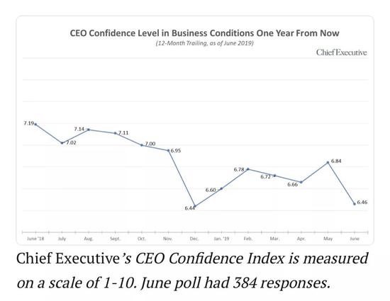 受關(guān)稅政策不確定性影響,美國企業(yè)承壓巨大。一項面向384名企業(yè)CEO的調(diào)查顯示,受到美國政府關(guān)稅和貿(mào)易政策的影響,美國企業(yè)CEO信心指數(shù)在下降,與去年同期相比,企業(yè)CEO信心下降了10%,而今年5月中美貿(mào)易磋商未果,也導(dǎo)致了6月份企業(yè)CEO信心指數(shù)猛跌。