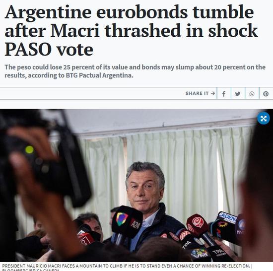 阿根廷舉行總統(tǒng)初選,現(xiàn)任總統(tǒng)毛里西奧·馬克里僅獲得了32.1%的選票。他的意外落敗給阿根廷的金融市場(chǎng)帶來(lái)了巨大震動(dòng),阿根廷比索對(duì)美元匯率狂瀉25%,主要股指暴跌38%。