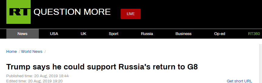 據(jù)“今日俄羅斯”(RT)報(bào)道,特朗普20日在白宮會(huì)見(jiàn)羅馬尼亞總統(tǒng)克勞斯·約翰尼斯時(shí)表示,俄羅斯重回G7之列是“再合適不過(guò)的”。他說(shuō),如果有另一位集團(tuán)成員提議恢復(fù)俄羅斯的成員資格,他將會(huì)支持。