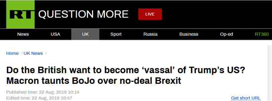 距離最后期限(10月31日)僅剩不到三個月,英國“脫歐”危機似乎呈現(xiàn)出愈演愈烈之勢。當(dāng)?shù)貢r間22日,首次以英國首相身份亮相國際舞臺的鮑里斯﹒約翰遜,還沒等到七國集團(G7)峰會的開幕,便被馬克龍“奚落”了一番。這位法國總統(tǒng)表示:英國終將成為美國的附庸國。