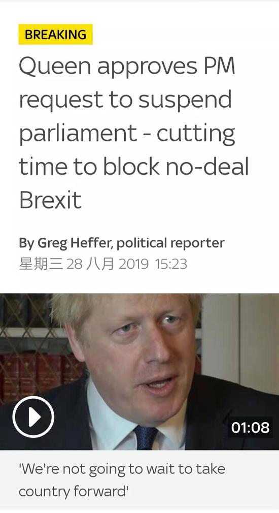 然而,此次鮑里斯請求的休會時間長達(dá)5周。據(jù)英國廣播公司(BBC)28日早些時候的報道,本來議員們將在9月3日結(jié)束休假回到議會開始新的會期。若女王同意議會休會,議員們將不得不從9月10日開始休會,直至10月14日。