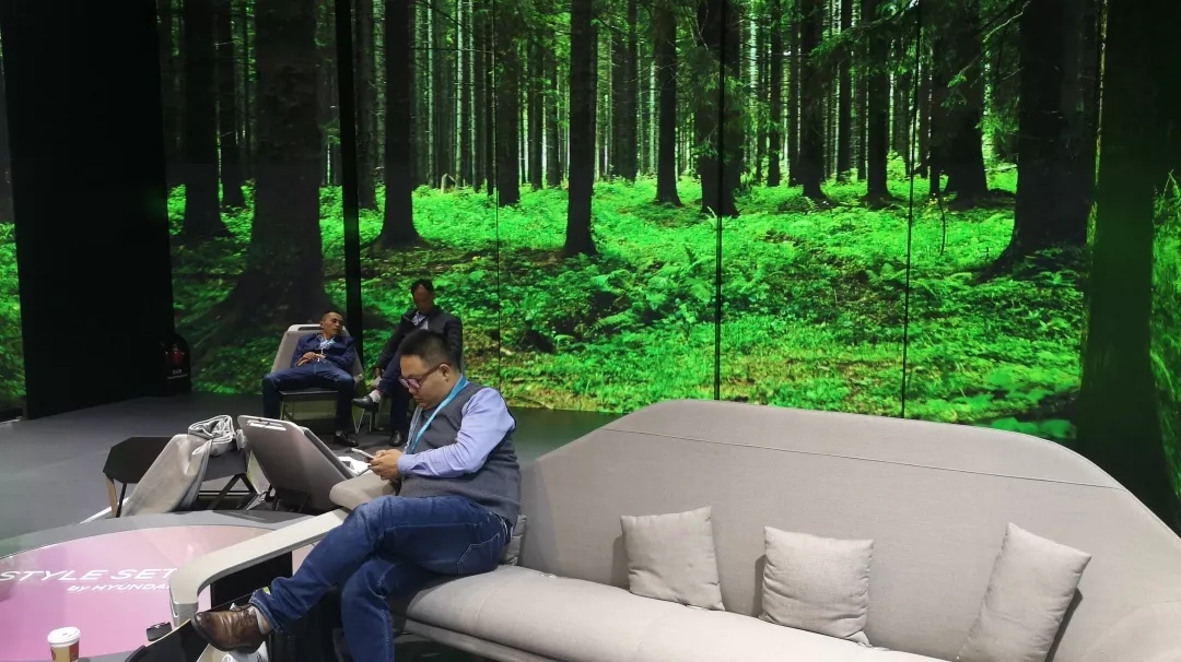 我在其他展位時,就被這個展位里L(fēng)ED視頻播放的綠色森林吸引過來,在喧鬧的場館里,好像一下子提供了讓人寧靜的心靈歸屬。LED屏是高低不同的多塊裝置在一起的,比一整個平面有新意很多。