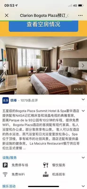 展團(tuán)入住的是五星級(jí)的Bogota Plaza Summit Hotel & Spa,地理位置很棒!8.9的好評(píng)屬于高檔商業(yè)樓、寫字樓、富人區(qū),并且中資公司都在附近~主要環(huán)境、治安都是非常好!第一大連鎖超市carulla距離我們酒店不到五分鐘路程(第二第三分別是Exito、Olimpica)